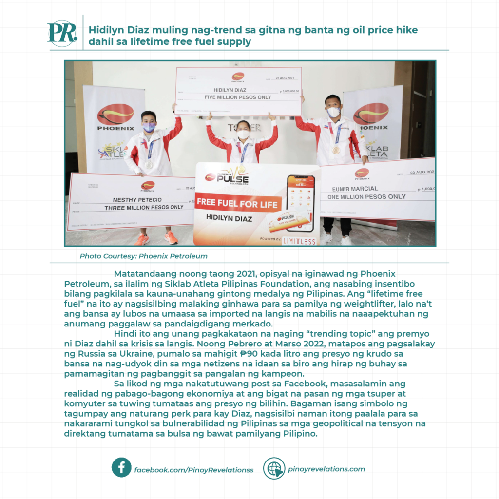 Matatandaang noong taong 2021, opisyal na iginawad ng Phoenix Petroleum, sa ilalim ng Siklab Atleta Pilipinas Foundation, ang nasabing insentibo bilang pagkilala sa kauna-unahang gintong medalya ng Pilipinas. Ang “lifetime free fuel” na ito ay nagsisilbing malaking ginhawa para sa pamilya ng weightlifter, lalo na’t ang bansa ay lubos na umaasa sa imported na langis na mabilis na naaapektuhan ng anumang paggalaw sa pandaigdigang merkado.